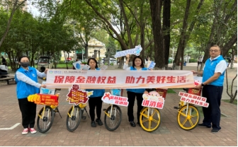 天津分公司的骑行宣传小队从海光寺商圈出发,车筐里摆着太平吉象和“消保团子”玩偶,悬挂着醒目标语,一路骑行至街边公园、公交站、学校等人流密集区,向市民发放折页、讲解知识。“共享单车+金融宣传”,既环保又亲民,真正让知识“骑”进百姓心里。